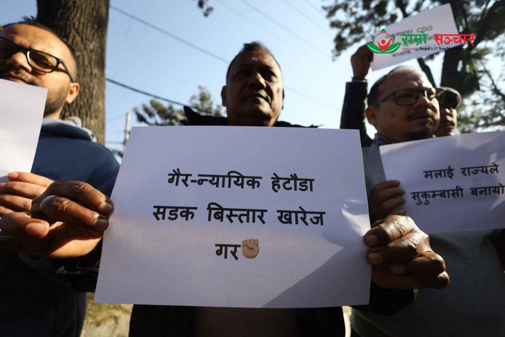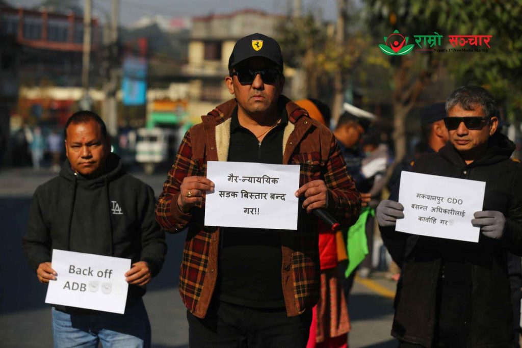 हेटौँडामा २५ गजको सडक सीमाभित्रका मुख्य बजार क्षेत्रका घर टहराहरू सरकारी पक्षले भत्काएपछि त्यहाँका स्थानीयहरूले प्रदर्शन गरेका हुन् ।